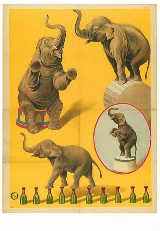 A modern postcard reproducing a 1909 circus poster of performing elephants. One elephant is sitting, one is standing on a rolling tub, one is standing on two feet on a tub, and one is walking on bottles. The poster was originally published by the Adolph Friedländer company of Hamburg, Germany.