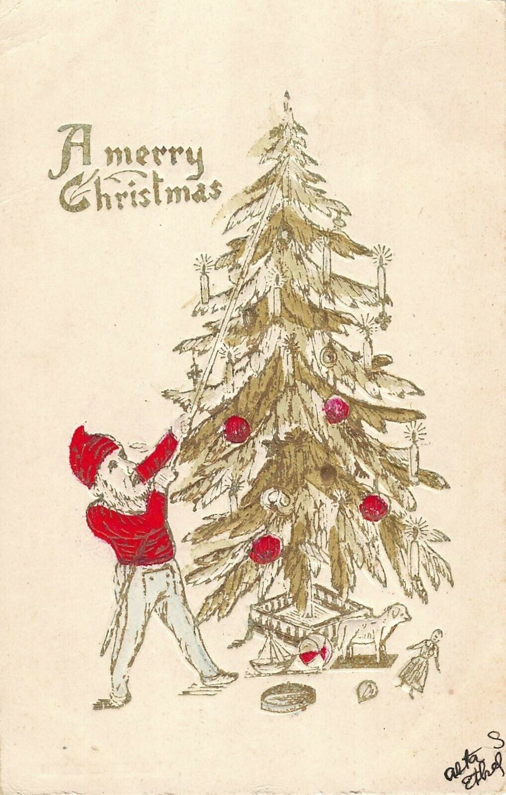 elf lighting tree hand colored c1908 Austria Christmas postcard ac150