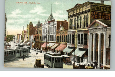 ELGIN IL Grove Ave Trolley Street Scene c1910 Postcard