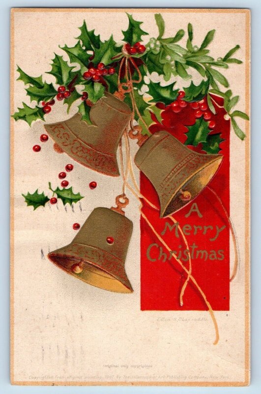 Ellen Clapsaddle Signed Postcard Christmas Ringing Bells Holly Berries Denver CO
