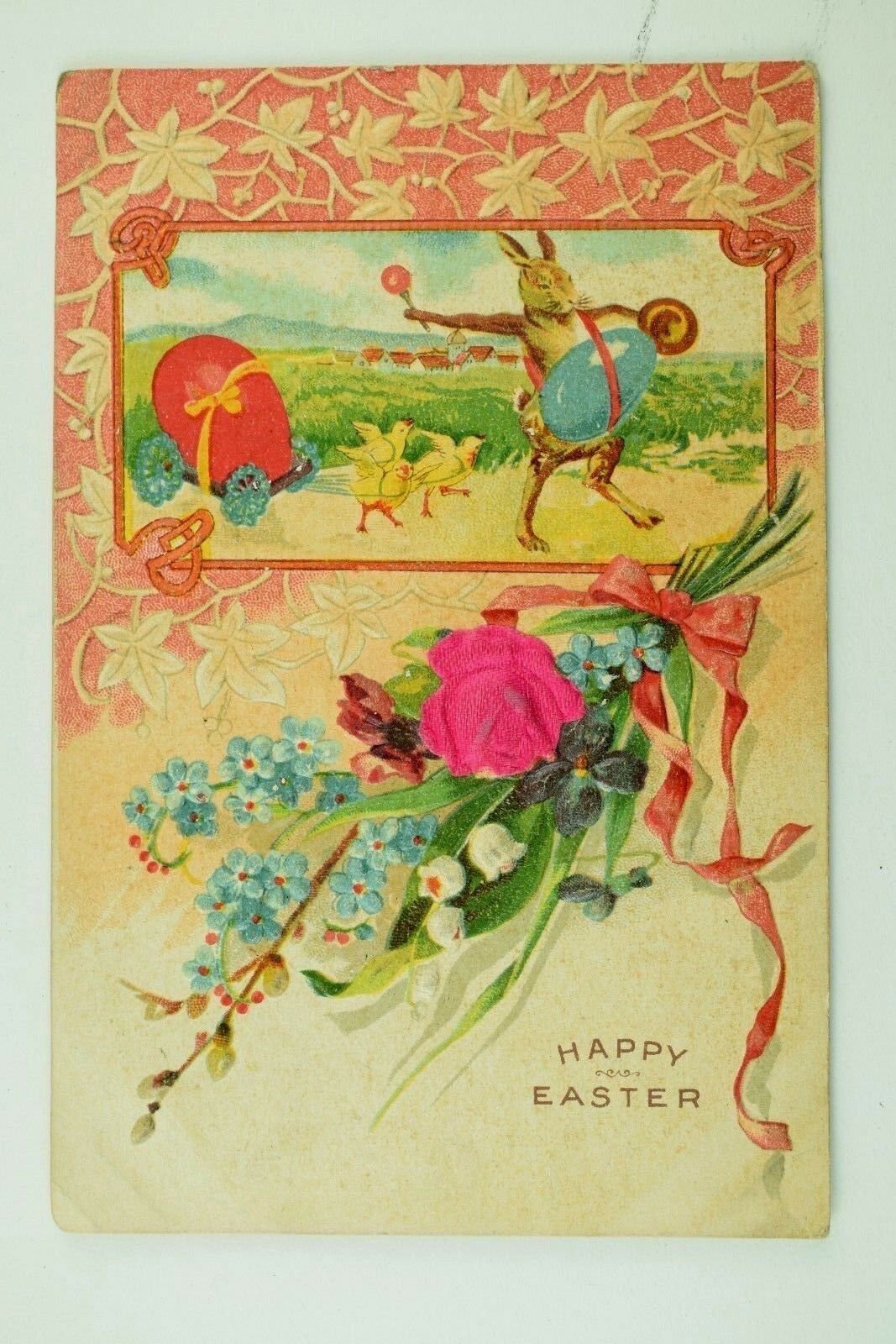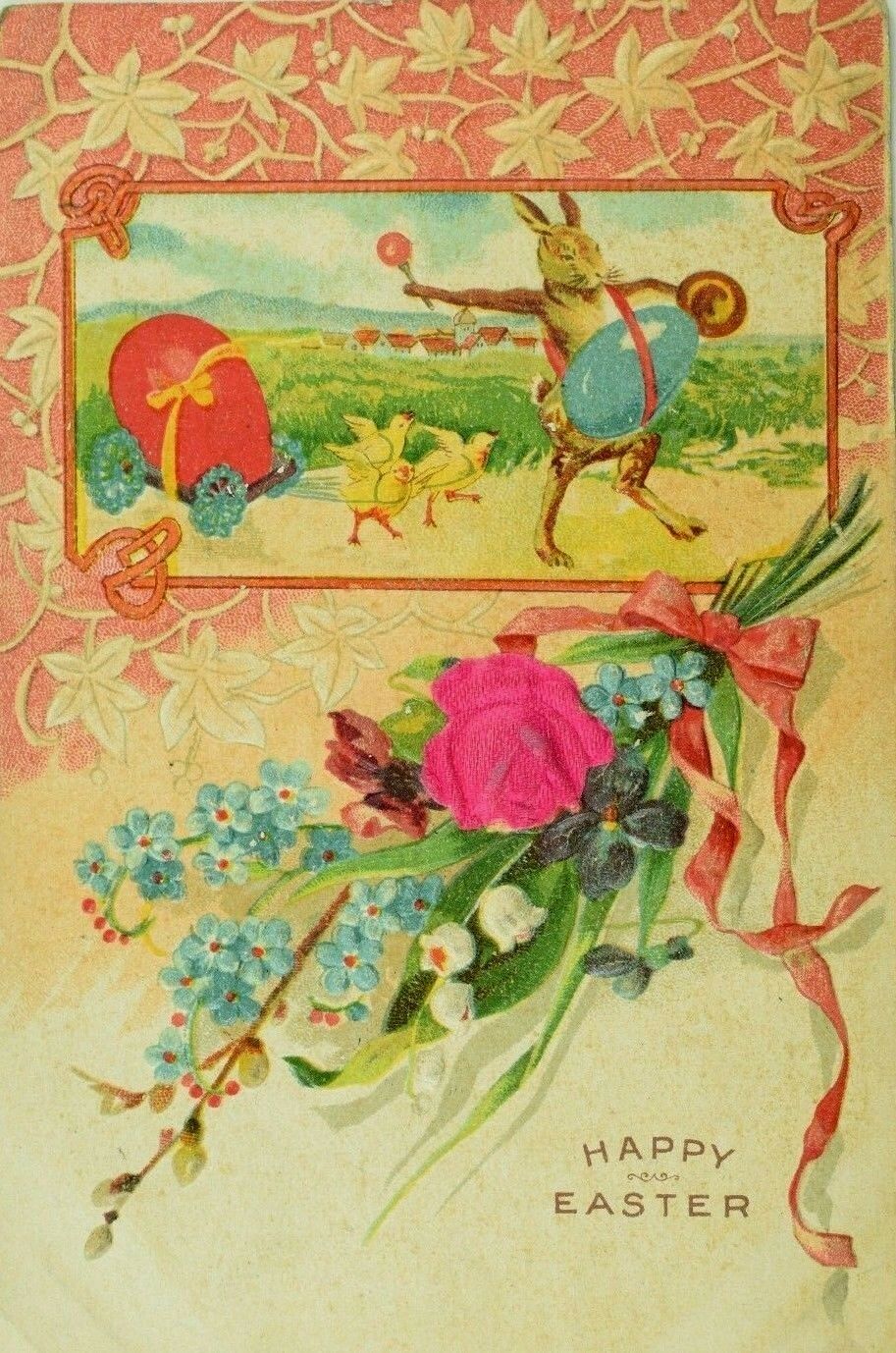 Embossed C. 1910 Easter Anthropomorphic Rabbit & Chicks Flowers Postcard P77