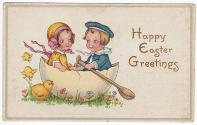 Embossed Easter Postcard Boy & Girl in an Egg Boat