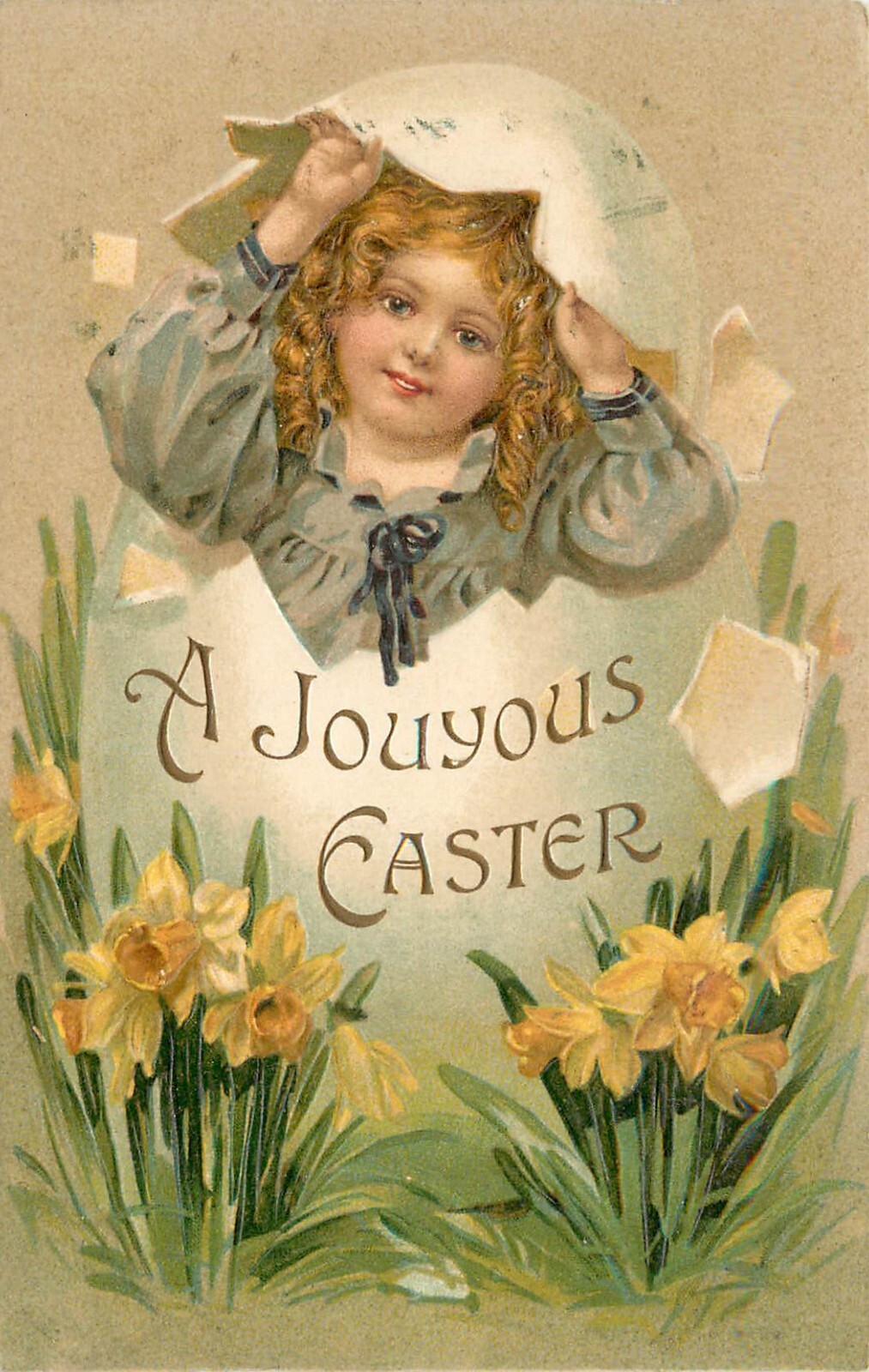 Embossed Joyous Easter Postcard Girl Breaks Out Of Egg
