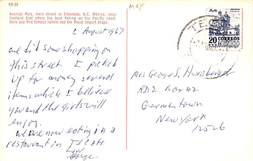 Ensenada Mexico Tarjeta Postal Postcard 1967, Grade: 1 Size: Regular size: Approx 3 1/2 X 5 1/2 inch (9 cm X 14 cm) Grading Scale: Grade 1 = Perfect corners Grade 2 = Very Minimal corner wear, no creases Grade ... Read More
