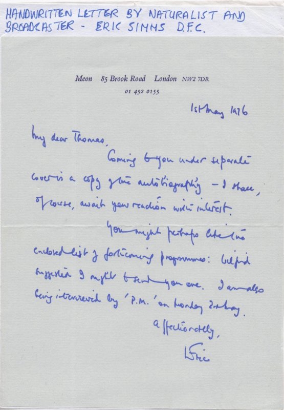 CHAU4668 A vintage rare opportunity to secure this 1976 letter from Eric Simms, English ornithologist, naturalist, writer, sound recordist, broadcaster and conservationist, as well as a decorated wartime Bomber Command pilot on his official headed paper approx 9" x 7" which is in its protective sleeve easily removed but scanned with this on to keep it absolutely mint (please disregard the white header at the top of the scan as this is just the owners identification and part of its outer packaging) There is just a middle fold where it was posted some 50 years ago but otherwise it is mint condition and you will never get a better autograph opportunity than a full hand written letter on Eric Simm's official home headed paper.