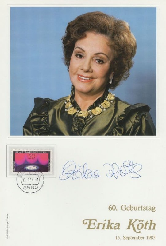 CHAU2372 Never will you get a better opportunity for an Erika Koth autograph than this official signed souvenir from the German soprano and large 10" x 8" first day cover dated 13th September 1985 with a stunning large photo of Erika Koth with souvenir stamp together with special commemorative hand franked first day of issue postmark which she has personally signed the souvenir by hand and with an undedicated signing too - you will never find a better listing than this for authenticity being her official large hand autographed souvenir for fans back in 1985 and in pristine condition.