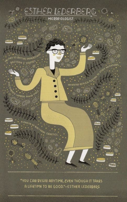 WS1 This beautiful rarely found and most specialist modern origin quirky postcard is a unique and wonderful souvenir to Esther Lederberg famous Microbiologist with an artist contemporary animated painting of her surrounded by the objects related to her studies together with one of her most memorable quotes resting underneath her portrait unused in brand new mint condition