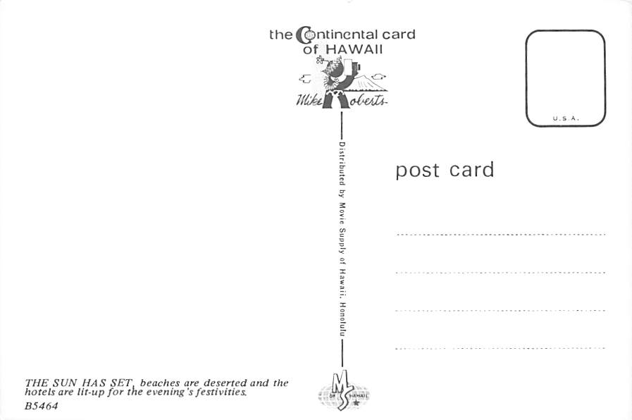 Evening in Waikiki - Hawaii Grade: 1 Category: Continental Size Postcard, Approx 4 in x 6 in (10 cm x 15.25 cm) Product Size: Continental size: 4X6 inches (10.5 cm x 15 cm) Grading Scale: Grade 1 = Perfect cor ... Read More