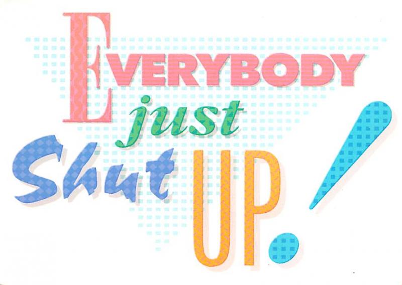 Everybody just shut up - Grade: 1 Category: Continental Size Postcard, Approx 4 in x 6 in (10 cm x 15.25 cm) Product Size: Continental size: 4X6 inches (10.5 cm x 15 cm) Grading Scale: Grade 1 = Perfect corner ... Read More