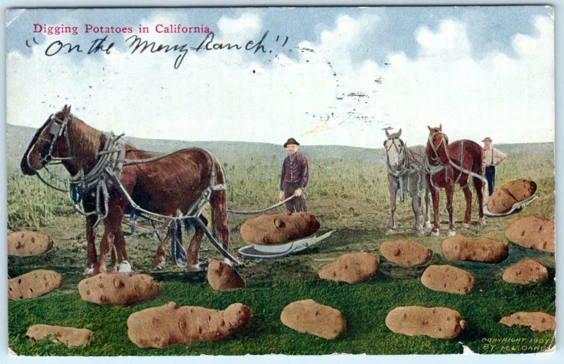 EXAGGERATION ~~ DIGGING POTATOES in CALIFORNIA 1910 Postcard