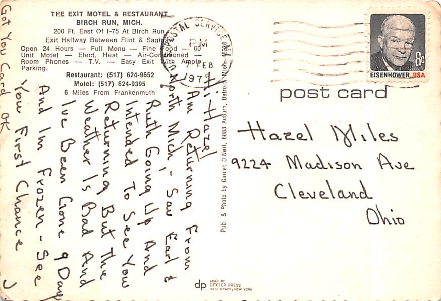Exit Motel & Restaurant - Birch Run, Michigan Grade: 3 Category: Continental Size Postcard, Approx 4 in x 6 in (10 cm x 15.25 cm) Product Size: Continental size: 4X6 inches (10.5 cm x 15 cm) Grading Scale: Gra ... Read More