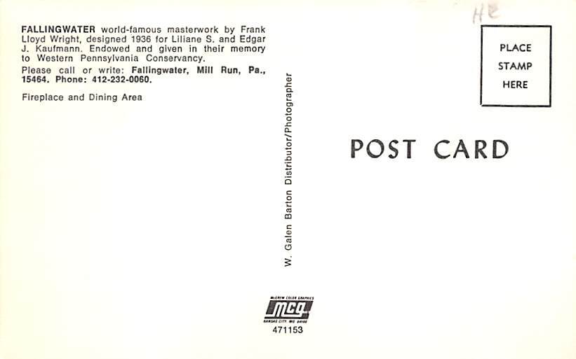 Fallingwater by Frank Lloyd Wright Fireplace and Dining Area - Mill Run, Pennsylvania PA Postcard Postal Date: Unused Grade: 1 Size: Regular Size Postcard - approximately 3 1/2 inch x 5 1/2 inch (9 CM x 14 CM) ... Read More