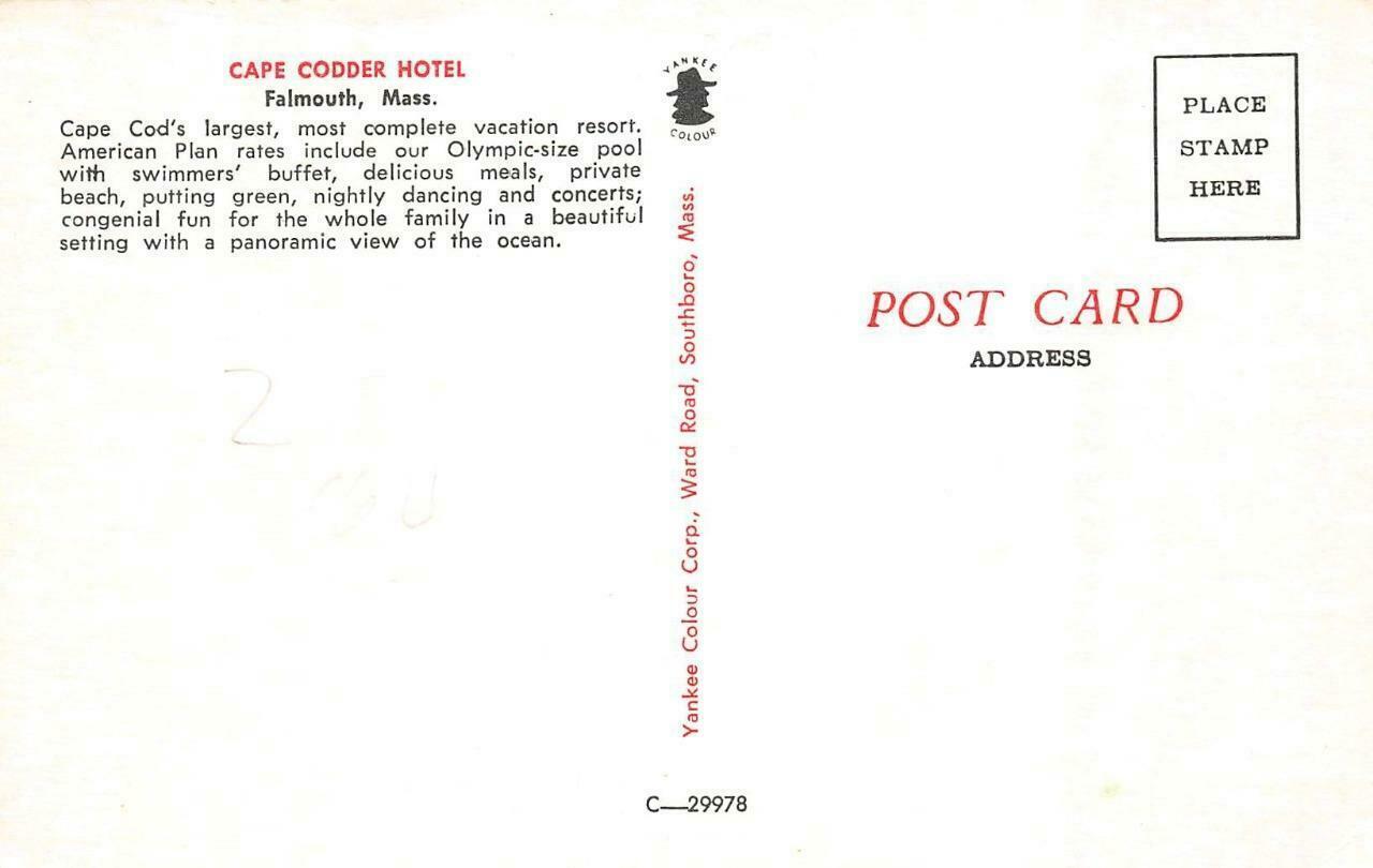 FALMOUTH, Massachusetts MA CAPE CODDER HOTEL Pool View ROADSIDE Postcard FALMOUTH, Massachusetts MA CAPE CODDER HOTEL Pool View ROADSIDE Postcard Click images to enlarge Description Please note that if in the image of the postcard back an odd colored shadow appears on one side, it is a scanner defect and it does not appear on the card. Item is described as accurately as possible. Please View My Other Items For Sale and be sure to Add me to your Favorite Sellers. Please be sure to Visit My Hip Store, new items are listed every week. Please don't hesitate to send me a question, before or after your purchase. I want to make sure your experience is a positive one and will respond promptly to all inquiries. I offer a full refund if you are unhappy with your purchase, so please buy with confidence. Pictures sell!Auctiva offers Free Image Hosting and Editing.300+ Listing Templates!Auctiva gets you noticed!The complete Hip Selling Solution.Track Page Views WithAuctiva's FREE Counter