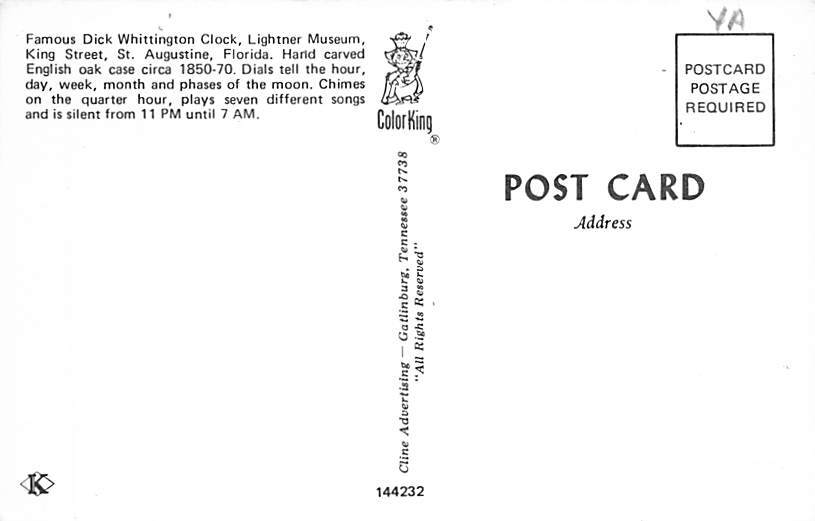 Famous Dick Whittington Clock Lightner Museum St Augustine, Florida USA Postcard - View Postcard Backing