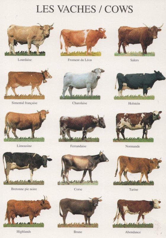 bg887 One of the most unusual cow cattle modern postcards I have sourced as this features 15 different species all named and some very unusual and rarely heard of cows -it is unused and mint.