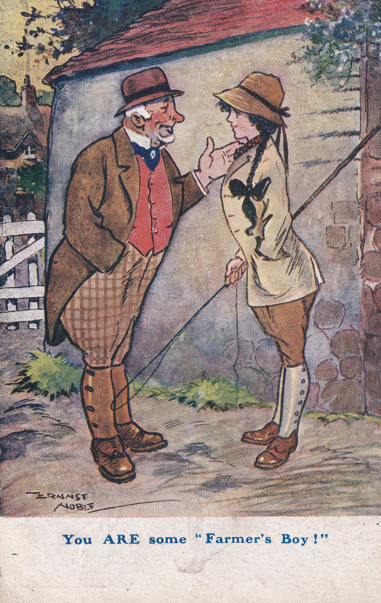 y38 A vintage WW1 postcard of courting on a farm - a little aged etc graded vg conditon - 1918 frank on reverse and mostly very good indeed - wonderful old farm comic postcard from the war and this farmer is after the horse riding lady.