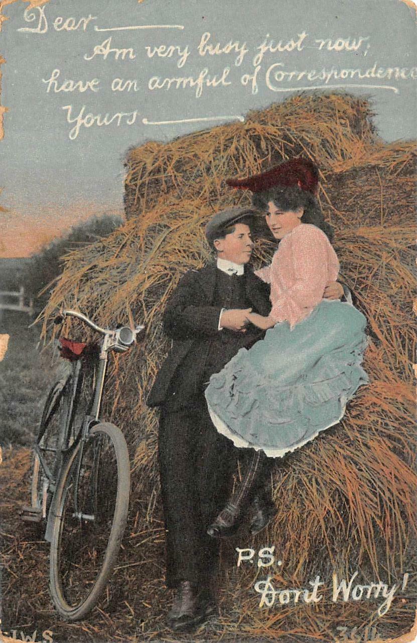 FARMING HAY STACK ROMANCE BIKE COMIC POSTCARD (c. 1910)