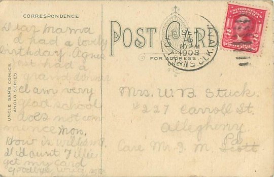 Description: A burly lady's dress is blown up as she crosses a subway grate. A newsboy and barber laugh at her from the sidelines. The caption reads: "Caught by the tide." The pillar behind her is marked "Subway Exit 14th St."Publisher: Uncle Sam's Comics, Anglo Series. Copyright 1907 by Irvin M Kline. Postmarked 1908.