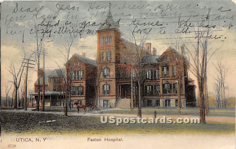 Faxton Hospital - Utica, New York Postcard - 1907 Grade: 2 Size: R - Regular size: Approx 3 1/2 X 5 1/2 inch (9 cm X 14 cm) Grading Scale: Grade 1 = Perfect corners Grade 2 = Very Minimal corner wear, no creas ... Read More
