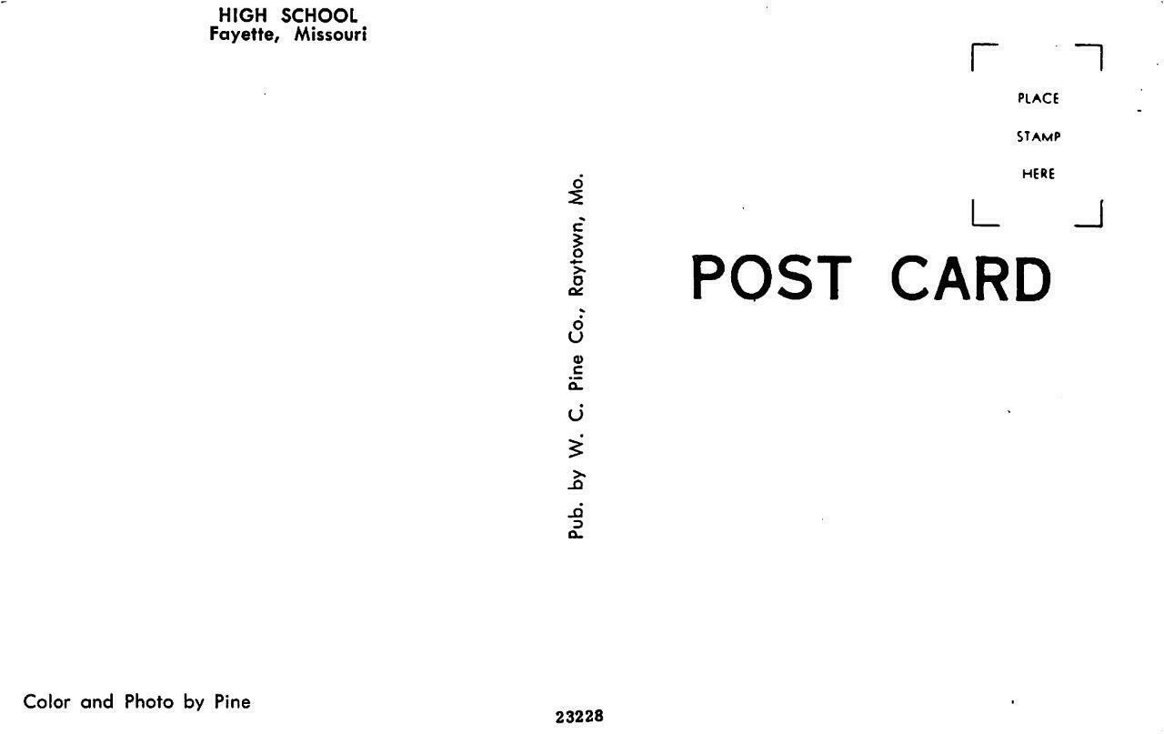 FAYETTE, MO Missouri HIGH SCHOOL Howard County c1950's Chrome Postcard FAYETTE, MO Missouri HIGH SCHOOL Howard County c1950's Chrome Postcard Click images to enlarge Description Please note that if in the image of the postcard back, an odd colored shadow appears on one side, it is a scanner defect and it does not appear on the card. Item is described as accurately as possible. Please View My Other Items For Sale and be sure to Add me to your Favorite Sellers. Please be sure to Visit My Hip Store, new items are listed every week. Please don't hesitate to send me a question, before or after your purchase. I want to make sure your experience is a positive one, and will respond promptly to all inquiries. I only sell standard size vintage postcards, shipped typically within 24 hours, in a cardboard stiffened envelope. I offer a full refund if you are unhappy with your purchase, so please buy with confidence. Pictures sell!Auctiva offers Free Image Hosting and Editing.300+ Listing Templates!Auctiva gets you noticed!The complete Hip Selling Solution.Track Page Views WithAuctiva's FREE Counter