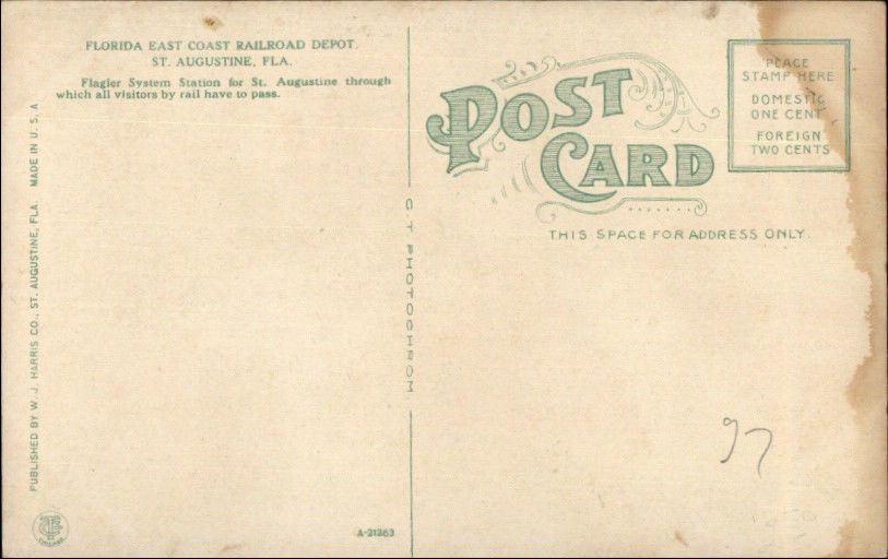 FEC RR Train Station Depot St. Augustine FL c1910 Postcard