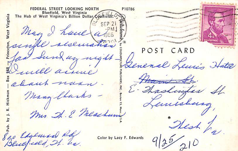 Federal Street , Bluefield, West Virginia WV Postcard - 1966 Grade: 2 small hole in card Size: R - Regular size: Approx 3 1/2 X 5 1/2 inch (9 cm X 14 cm) Grading Scale: Grade 1 = Perfect corners Grade 2 = Very ... Read More
