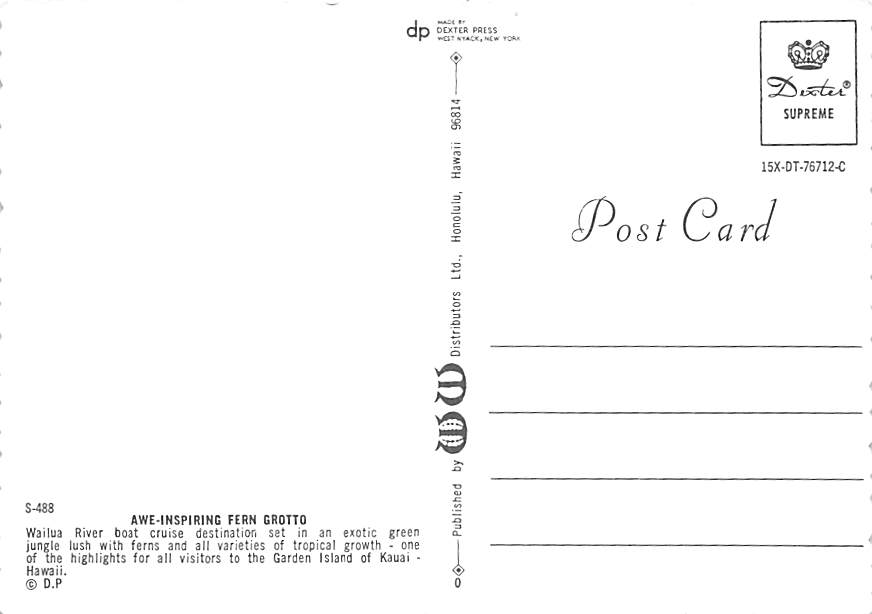 Fern Grotto - Kauai, Hawaii Grade: 1 Category: Continental Size Postcard, Approx 4 in x 6 in (10 cm x 15.25 cm) Product Size: Continental size: 4X6 inches (10.5 cm x 15 cm) Grading Scale: Grade 1 = Perfect cor ... Read More