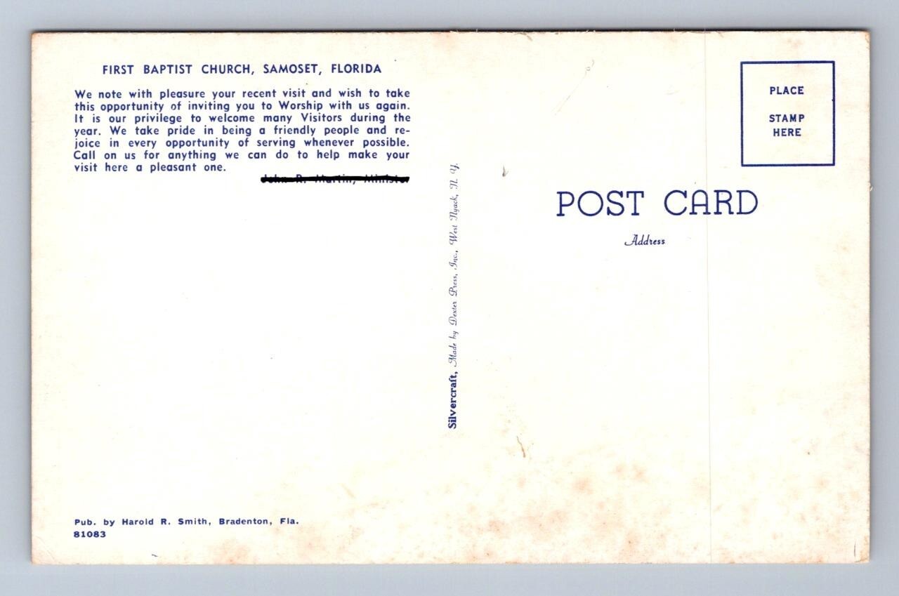 FIRST BAPTIST CHURCH SAMOSET FLORIDA DEXTER PRESS POSTCARD (c.1940s)