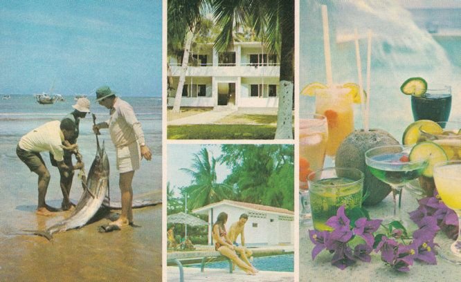 ts65 A rare 1980s postcard of fishing and other activities including drinking long cocktails at Shelly Beach Hotel in Kenya unused and in outstanding virtually mint condition