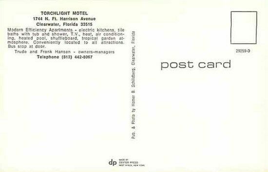 Clearwater, Florida, Torchlight Motel, Pool View Chrome Postcard. Publisher: Dexter Press, Homer B. Schildberg # 29259-D The corners are sharp. The image is bright and clean. Postally unused.