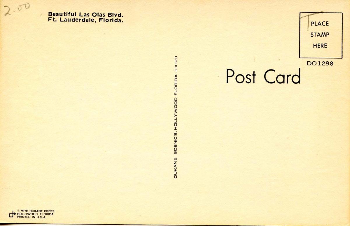 FL - Fort Lauderdale. Las Olas Boulevard E, Un, Db, C Grading of Postcards MINT (M): Perfect condition, no apparent blemishes, flaws, postally unused, may have some writing on back. NEAR MINT (NM): Like new, image ... Read More