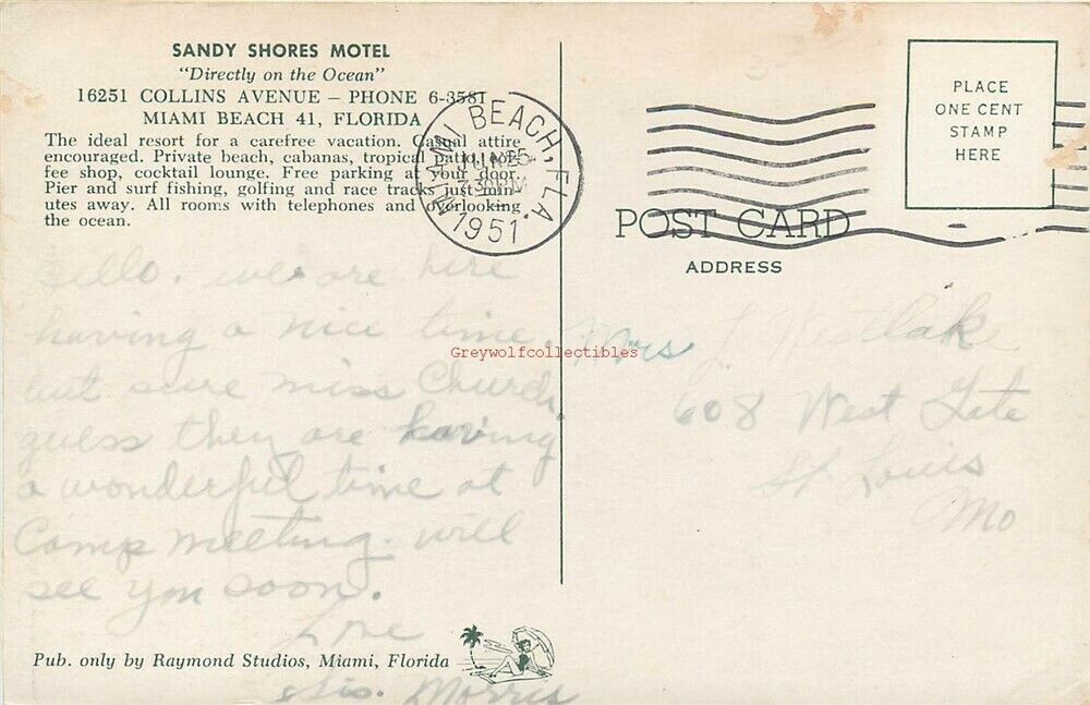 Chrome Postcard Miami Beach, Florida, Sandy Shores Motel Postmark: 1951 Image: Bright and clean Corners: Light wear Faults/Other: Crease bottom left corner