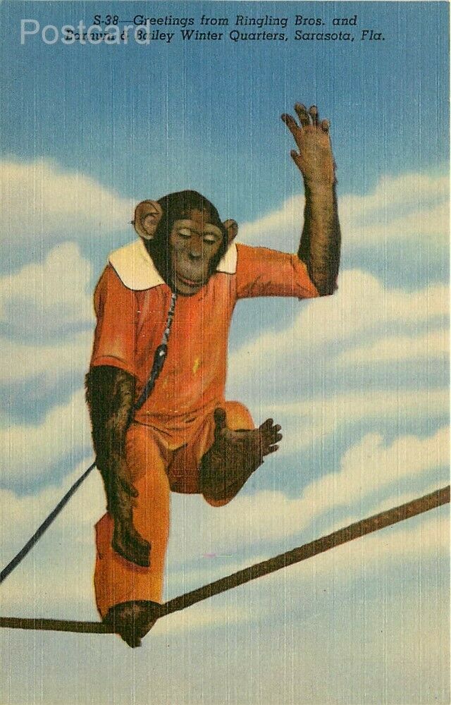Linen Postcard Sarasota, Florida, Ringling Brothers, Winter Quarters, Monkey, Greetings Postmark: None Image: Nice and clean Corners: Very light wear Faults/Other: