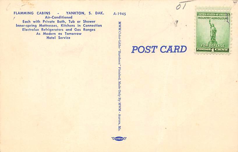 Flaming cabins Yankton SD Postcard - Unused Grade: 1 Size: R - Regular size: Approx 3 1/2 X 5 1/2 inch (9 cm X 14 cm) Grading Scale: Grade 1 = Perfect corners Grade 2 = Very Minimal corner wear, no creases Gra ... Read More