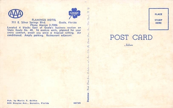 Flamingo Motel Ocala, Florida Postcard , Grade: 2 Size: Regular Size Postcard - approximately 3 1/2 inch x 5 1/2 inch (9 CM x 14 CM) Grading Scale: Grade 1 = Perfect corners Grade 2 = Very Minimal corner wear, ... Read More