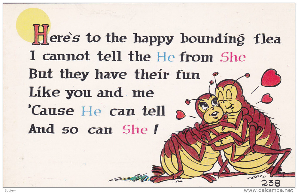Flea Couple in Love, Poem, 40-60s :: Postcard, 3.5" by 5.5", Chrome, EX