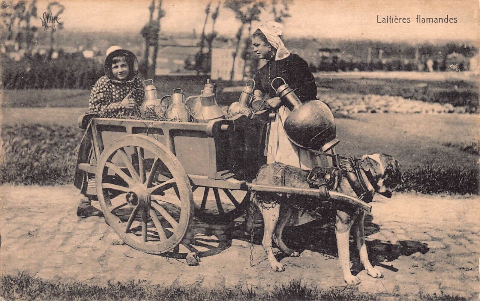 Flemish milkmaid laitiere flamande dog pulled cart vintage postcard