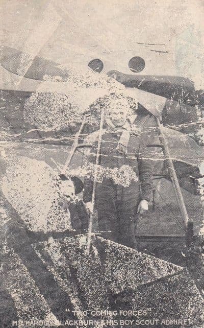 Antique very early 1900s aviation postcard of flight pilot Harold Blackburn with a boy scout admirer - Please note this card is very very worn with whiting creasing etc - For serious enthusiasts only