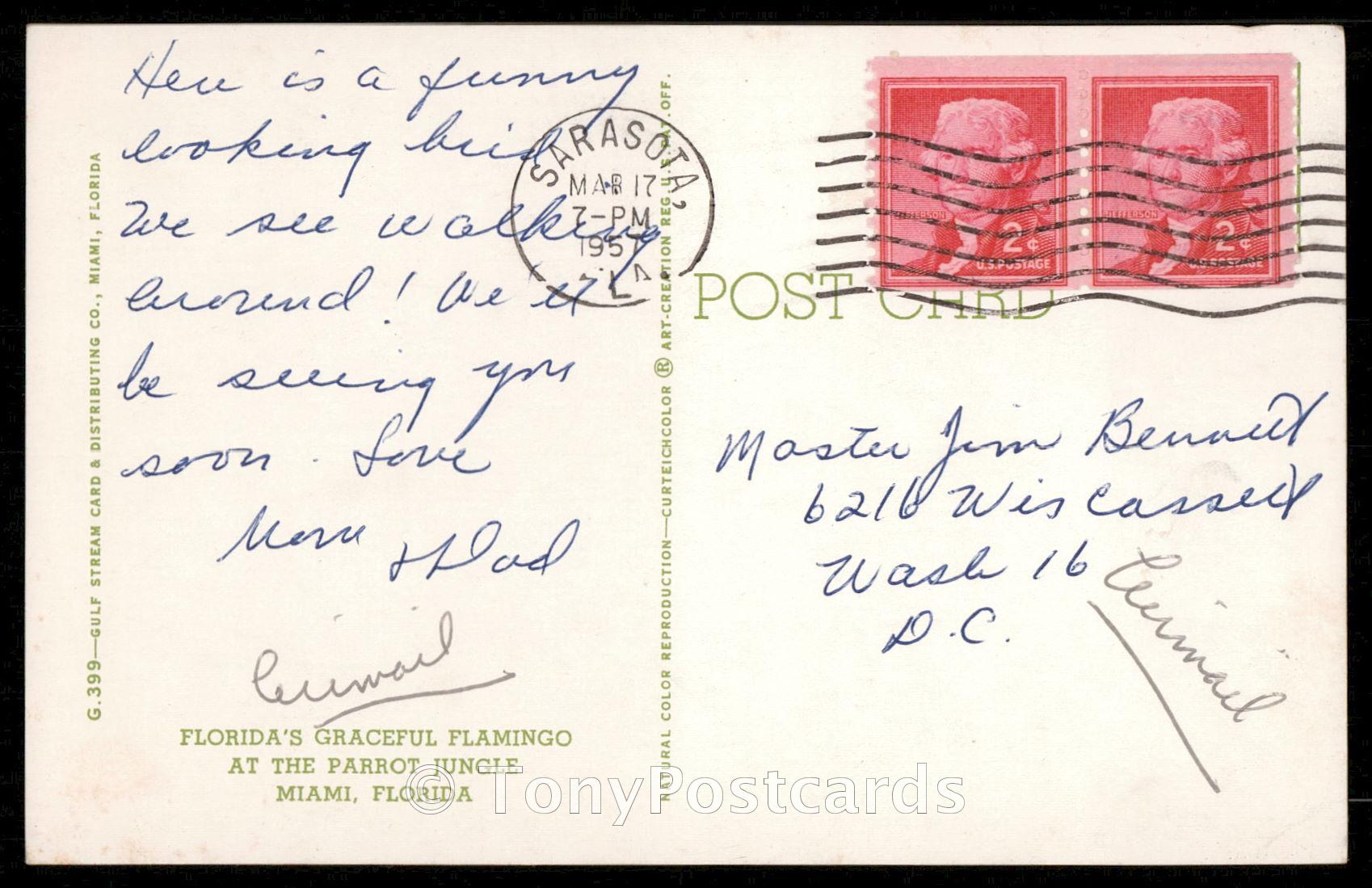 Title: FLORIDA'S GRACEFUL FLAMINGO Condition: See scans Year: 1957 Postmark: Sarasota Mar 17, 1957 FLA Publisher: Gulf Stream Card & Distributing Co. Keywords: Parrot Jungle Miami Curteichcolor Related Categ ... Read More