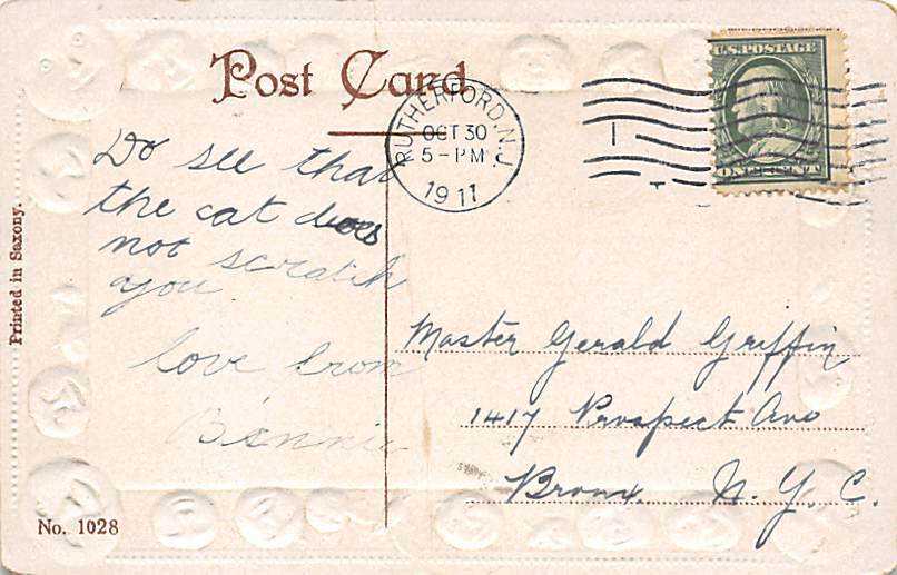 Flying Witch Halloween Postcard 1911, Grade: 4, , Size: Regular Size Postcard - approximately 3 1/2 inch x 5 1/2 inch (9 CM x 14 CM) Grading Scale: Grade 1 = Perfect corners Grade 2 = Very Minimal corner wear, ... Read More