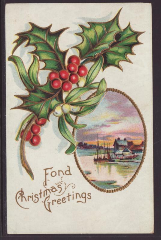 Fond Christmas Greetings,Holly,Scene Postcard