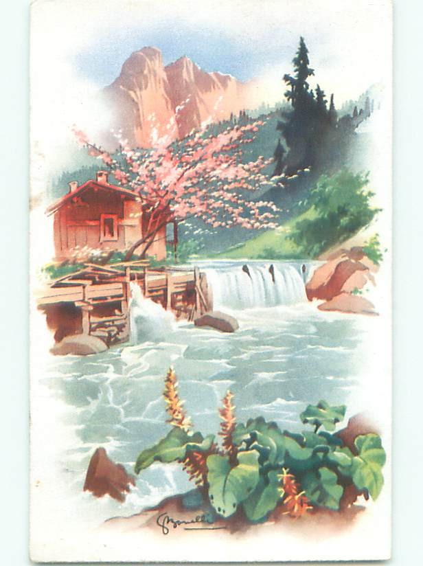 foreign Old Postcard signed PINK FLOWERING TREE AT THE WATERFALL AC2815