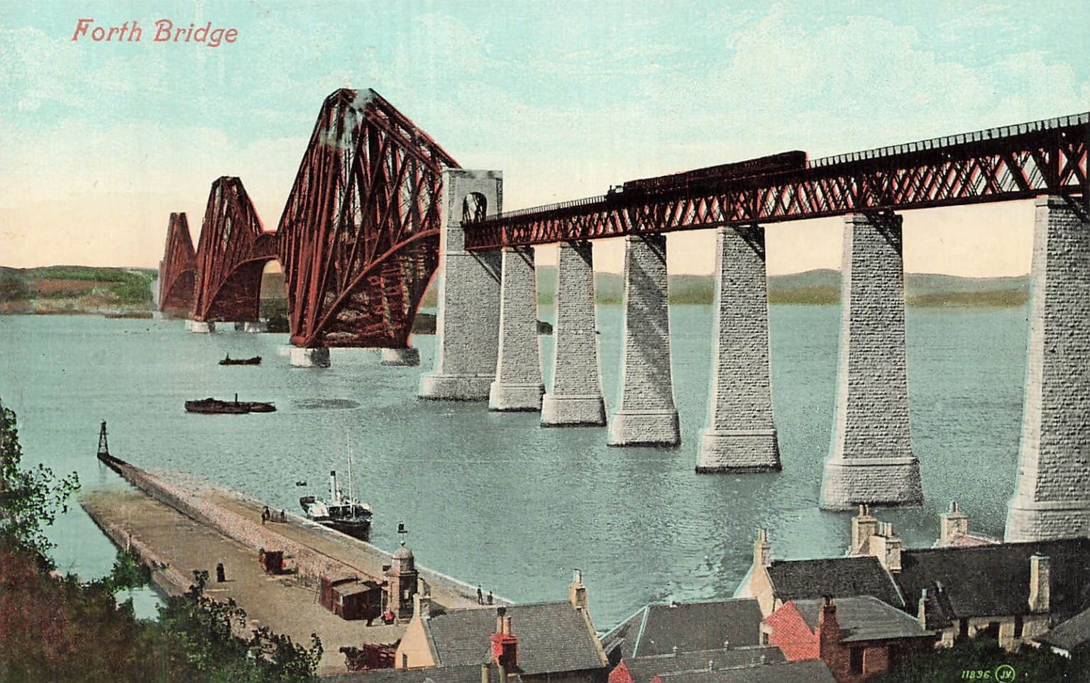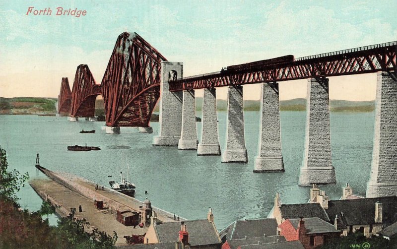 This exquisite vintage postcard captures the iconic Forth Bridge in Scotland, a marvel of engineering spanning the Firth of Forth. The image beautifully depicts the distinctive red cantilever structure, with a train actively traversing its tracks, offering a dynamic glimpse into early 20th-century transportation and infrastructure. Below the majestic bridge, the serene waters of the Firth of Forth are dotted with small boats near a bustling pier, while charming local architecture frames the foreground.Part of the renowned Valentine's Series, this postcard is a testament to the era's printing artistry, featuring vibrant color tints that bring the historic scene to life. Printed in Great Britain, it represents a significant piece of Scottish heritage and a collectible item for enthusiasts of railway history, bridge engineering, and vintage travel memorabilia. The detailed illustration and historical context make this a captivating addition to any collection.