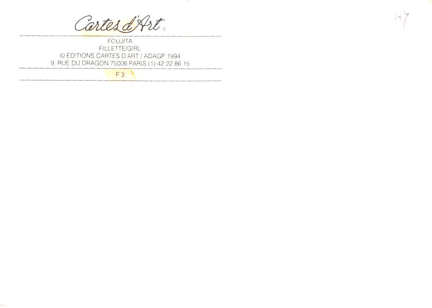 Foujita - Girl Grade: 2 Category: Continental Size Postcard, Approx 4 in x 6 in (10 cm x 15.25 cm) Product Size: Continental size: 4X6 inches (10.5 cm x 15 cm) Grading Scale: Grade 1 = Perfect corners Grade 2 = ... Read More