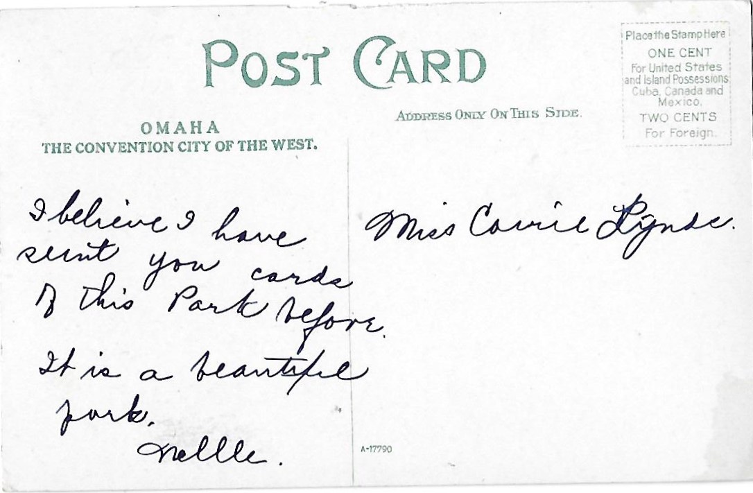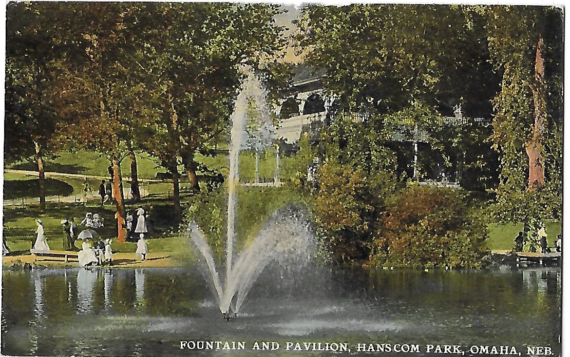 Fountain and Pavillion Hanscom Park Omaha Nebraska, People shown are wearing Victorian Clothing. Never mailed, but writing in ink on back side. Corner and edge wear.