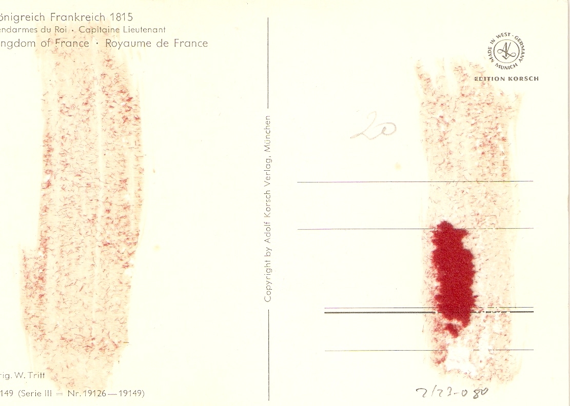 ""FRANC 1815 ARMY. CAVALRY liutenant BY W. TRITT" MODERN GERMAN POSTCARD. SIZE 15 X 10,5 CMS Publisher: EDITION KORSCH. MUNCHEN Artist: W. TRITT Condition: Divided. Unused Good condition. Some album residue on ... Read More