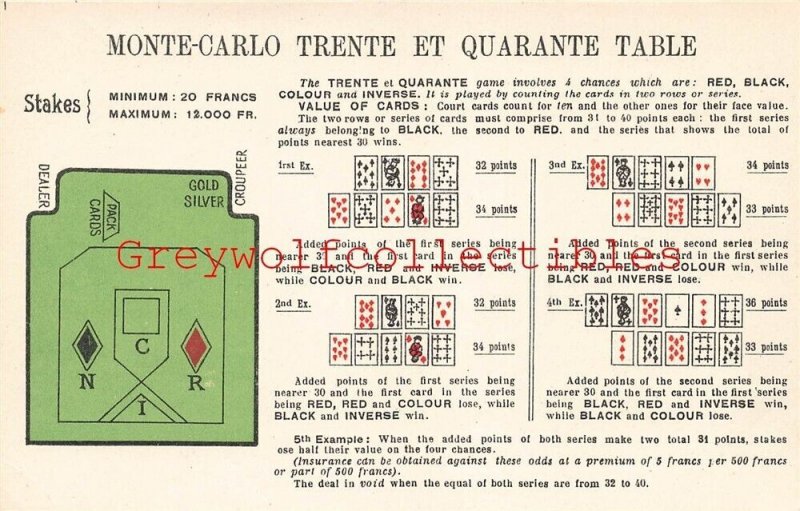 Printed Postcard France, Monte-Carlo, Trente Et Aqarante Table, Rules Postmark: None Image: Nice and clean Corners: Light wear Faults/Other: