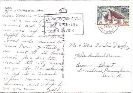 Nice card showing the Louvre in Paris. It is a beautiful picture and a good stamp and cancellation. Mailed from Paris to Lewistown, Pennsylvania in 1966