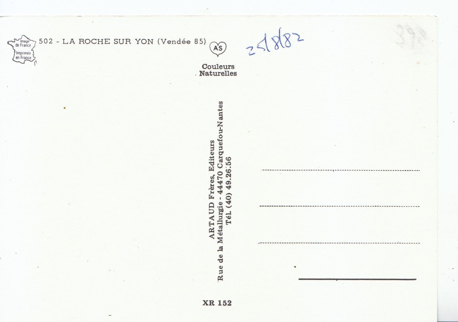 Mo's Postcards Postcard Description: France Postcard - La Roche Sur Yon - [Vendee 85] - Written in ink 25/8/82 Genealogy Information: Defect(s): The bottom and right hand edge have been trimmed Postage & Payment: For U.K residents the quoted P & P fee is for any number of postcards purchased at one time. Happy to quote for non UK residents. For multiple purchases please wait for an invoice Listing and template services provided by inkFrog