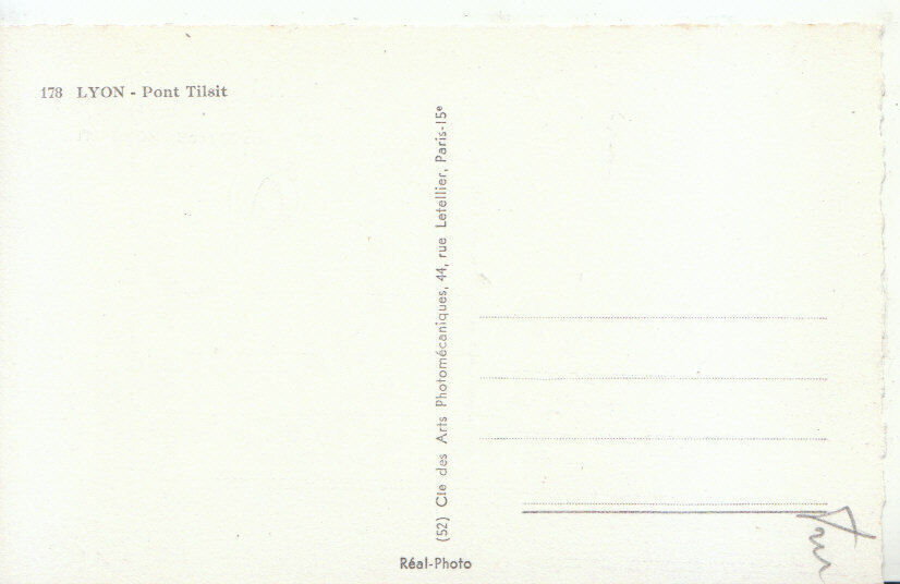 Mo's Postcards Postcard Description: France Postcard - Lyon - Pont Tilsit Genealogy: Defect(s): Mark in middle of card Postage & Payment: For U.K residents the quoted P & P fee is for any number of postcards purchased at one time. Happy to quote for non UK residents. For multiple purchases please wait for an invoice Listing and template services provided by inkFrog